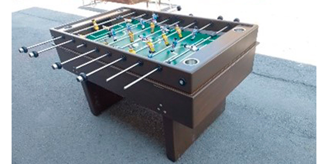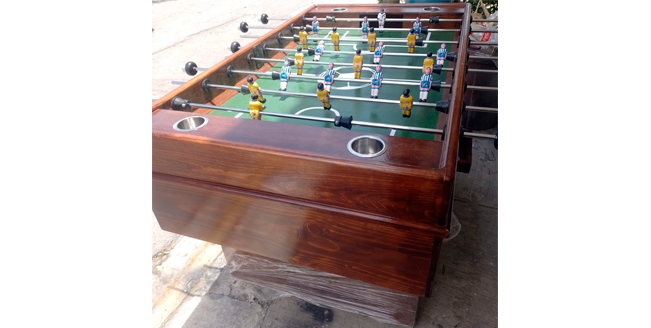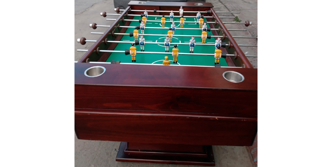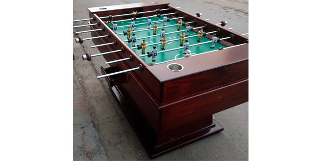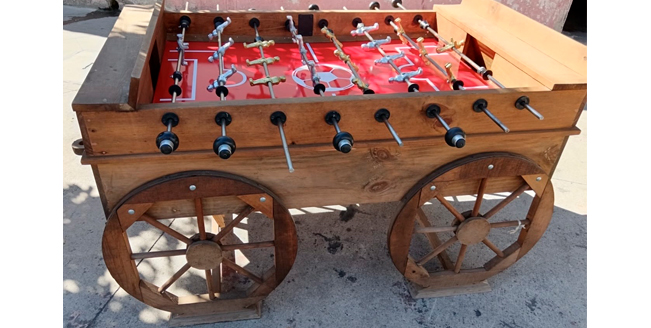 Fabricado en madera de pino, uso rudo, para 4 jugadores, varilla cromada sólida, monos de aluminio, con 4 porta vasos, perilla de seguridad.