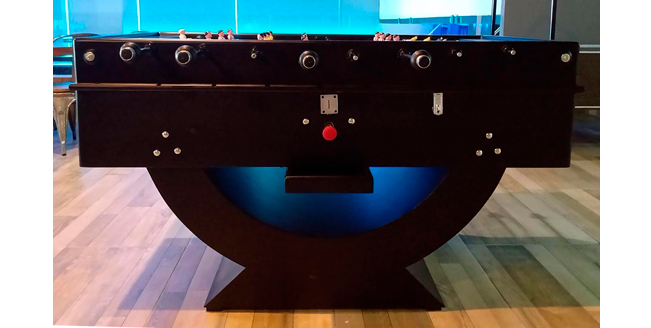 Fabricado en madera de pino, uso rudo, para 4 jugadores, varilla cromada sólida, monos de aluminio, con 4 porta vasos, perilla de seguridad, pata de 1 solo pedestal.